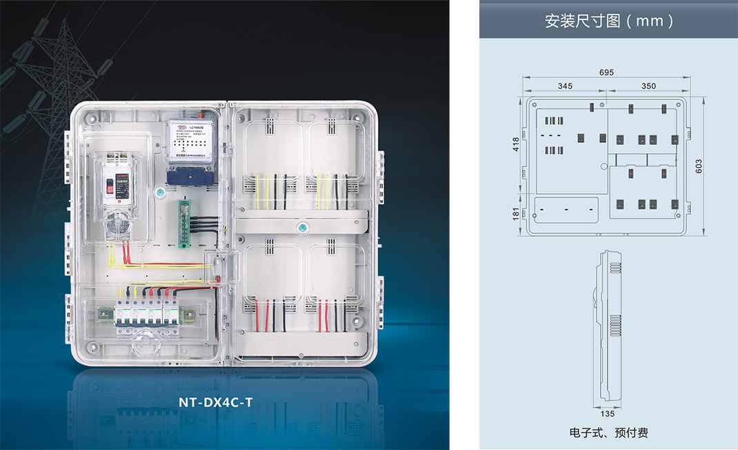 電表箱生產(chǎn)廠家-浙江南騰電氣有限公司研發(fā)的NT系列透明塑料電表箱,采用進(jìn)口聚碳酸酯(PC)和阻燃ABS工程塑料制成。具有抗沖擊、抗老化、耐腐蝕、透明度高、抗紫外線、安裝方便等優(yōu)點(diǎn),并且具有用電安全保護(hù),用戶分離控制,數(shù)據(jù)采集, 防盜電等功能。產(chǎn)品適合安裝電子式、機(jī)械式、智能IC卡預(yù)付式、智能多費(fèi)率式電表。南騰NT系列透明塑料電表箱自推出市場以來,憑借其完美的設(shè)計(jì)理念,在電表箱行業(yè)遙遙領(lǐng)先。