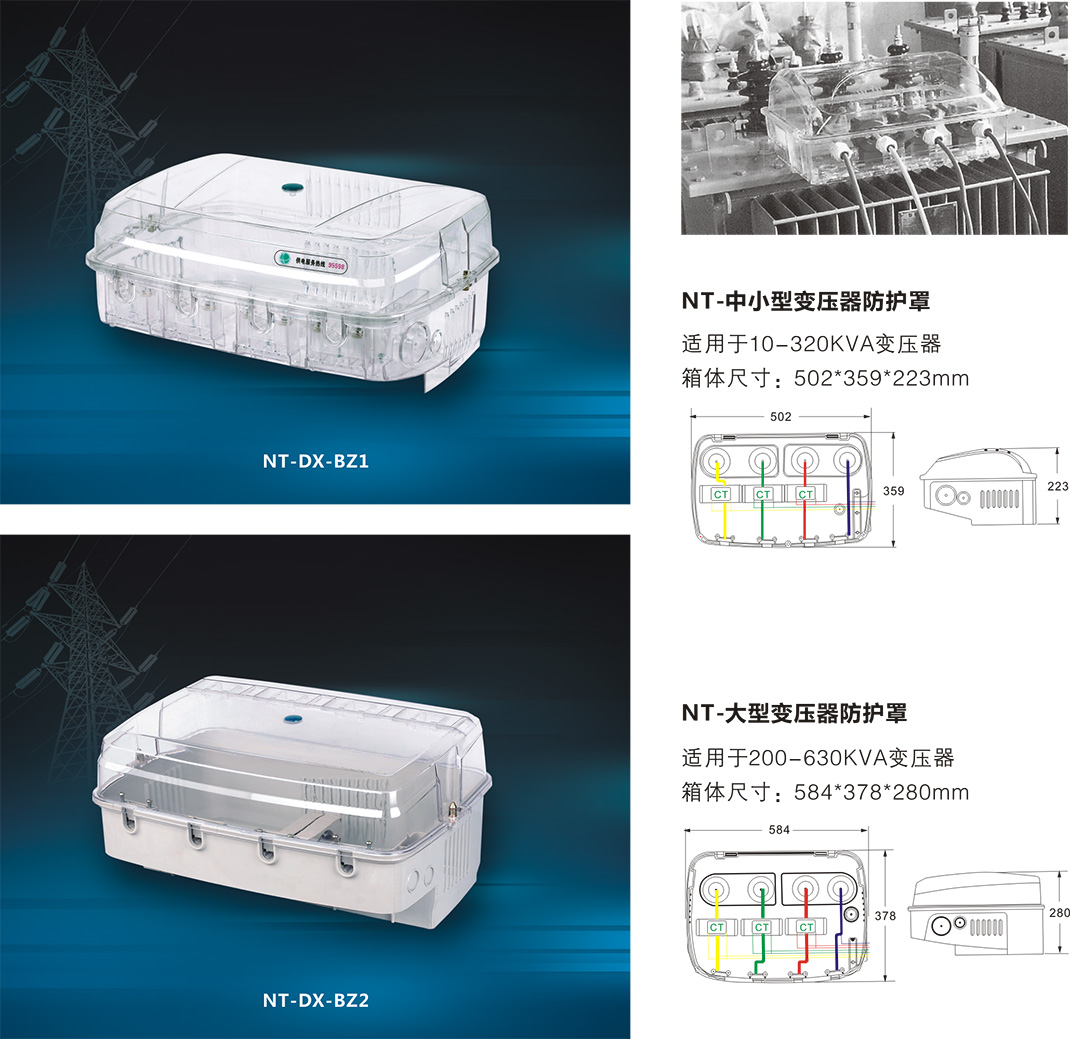 NT-DX-BZ系列防竊電變壓器防護(hù)罩箱體材料采用進(jìn)口聚碳酸酯(PC)和阻燃ABS工程塑料制成。對(duì)配電變壓器低壓出線側(cè)實(shí)施全封閉保護(hù)。在不打開保護(hù)罩的前提下,異物無(wú)法觸及低壓出線接線柱,從而有效防止竊電行為發(fā)生。保護(hù)罩內(nèi)預(yù)留互感器安裝位、二次回路出線孔及電纜固定夾,可配合多功能計(jì)量配電箱使用,實(shí)現(xiàn)電表箱與電流互感器分開安裝,實(shí)現(xiàn)“線進(jìn)管、管進(jìn)箱、箱加鎖”的全封閉防竊電目標(biāo)。